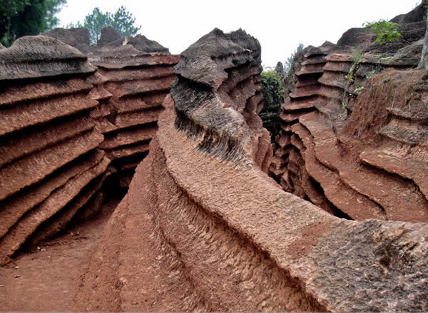 在路邊一棵樹下,一排直徑有30厘米粗、1米多高,排列得像牙齒一般細(xì)密的石柱躲在樹蔭下,似乎在躲著陽(yáng)光。幾個(gè)多小時(shí)的探尋過程中,“石林”總是讓人驚喜,爬行的劍龍、攀行的巨猿、雅致別趣的“蓮花寶座”和莊嚴(yán)的“佛手”,讓人流連忘返 ……當(dāng)?shù)卮迕裣蛴浾呓榻B道,這只是整個(gè)“石林”的一部分,最大的一片石林大約方圓600畝左右,大部分是紅褐色。前幾年有人帶著專家來考察,說這片石林已經(jīng)沉睡了4億年,是揚(yáng)子古海海底沉積的混合泥砂的碳酸鹽物質(zhì)形成的巖石,再經(jīng)地殼運(yùn)動(dòng)和侵蝕、溶蝕作用,就形成今天的奇觀。但卻由于投入資金量及交通等方面的考量,遲遲沒有人投資。