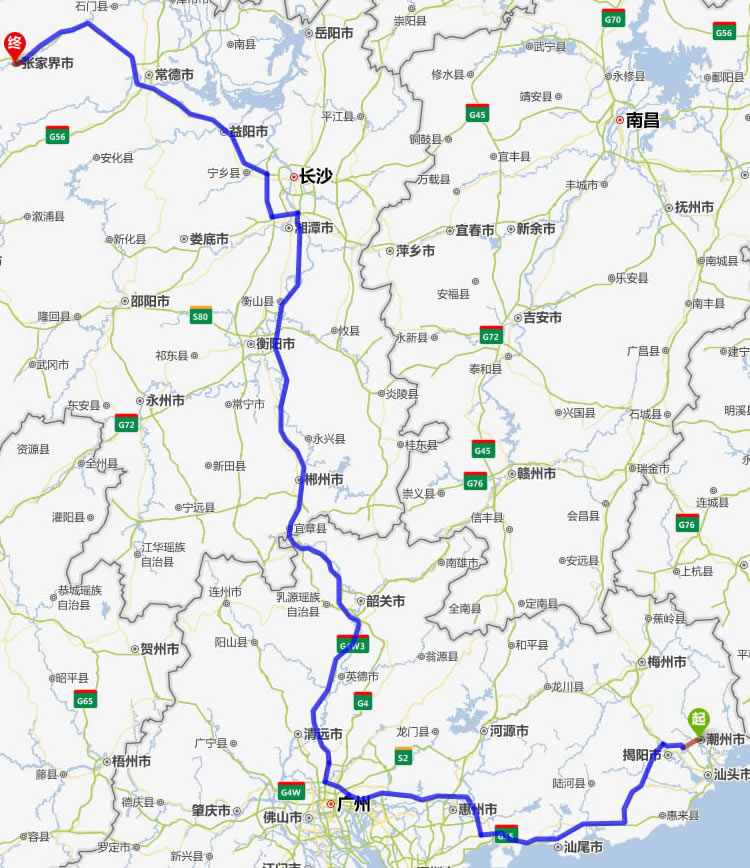 現(xiàn)在位置:張家界旅行社->交通指南->自駕車(chē)路線(xiàn) -> 潮州到張家界旅游自駕車(chē)線(xiàn)路,潮州去張家界自己開(kāi)車(chē)要多長(zhǎng)時(shí)間,有多少公里