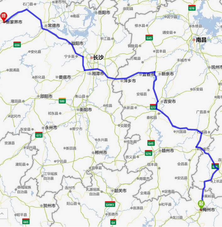 梅州去張家界自駕車自助游線路圖全程高速):