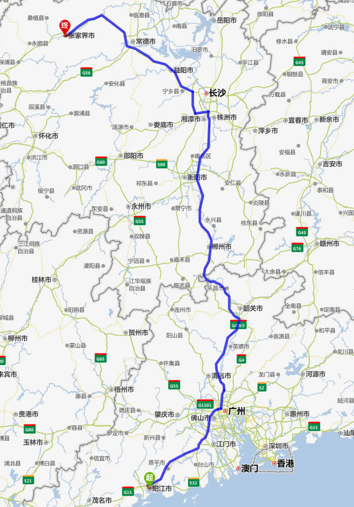 陽(yáng)江去張家界自駕車(chē)自助游線(xiàn)路圖全程高速):