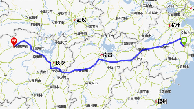 天臺(tái)去張家界自駕車(chē)自助游線路圖全程高速):