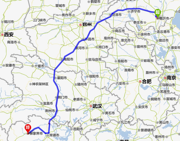 左右,沿途經過臨沂——濟寧——菏澤——蘭考縣——開封——尉氏縣——許昌市——平頂山——南陽——襄陽——荊門——荊州——常德(也可以走國道經澧縣、石門縣)——慈利——張家界。