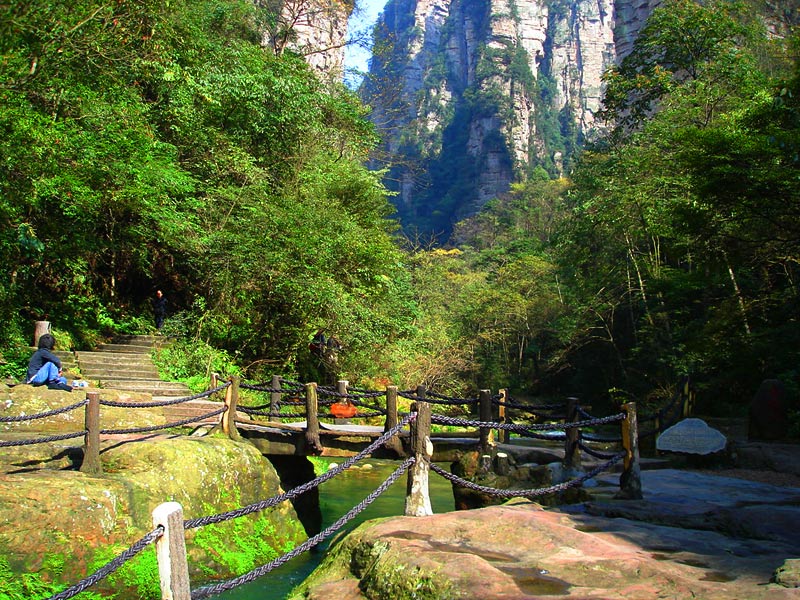 上 午:導(dǎo)游與司機(jī)在機(jī)場或車站、酒店舉牌接游客,然后乘車40分鐘前往【張家界國家森林公園】(門票已含),徒步游覽“世界上最美麗的峽谷”---【金鞭溪景區(qū)】,(包含觀音送子、豬八戒背媳婦、神鷹護(hù)鞭、劈山救母、西游記外景拍攝地、長壽泉、千里相會(huì)等景點(diǎn))。走完金鞭溪后,有兩種游覽方式上至山頂?shù)摹驹医缇皡^(qū)】(其一:可從金鞭溪的千里相會(huì)從亂竄坡徒步上袁家界,其二:可從水繞四門乘坐環(huán)保車至百龍電梯下站,然后乘坐世界戶外第一電梯至山頂?shù)脑医,百龍電?2元/人游客自行購買)。